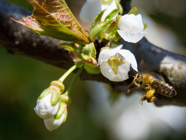 Das führt mich auch direkt zu einem großen Nutzen für unsere Nachbarn: die Bestäubungsleistung der Bienen. Im direkten Umfeld des Bienenstandes finden sich zahlreiche Obstbäume. Vor allem die Kirschen sind bei den Bienen sehr beliebt, da sie die erste große Nektarquelle bieten.